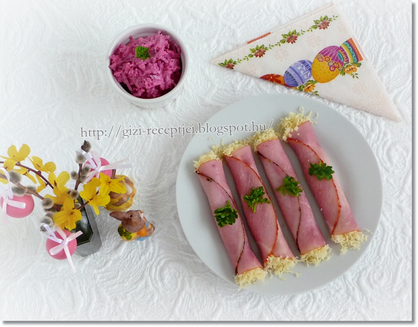 A húsvéti ünnepekre idén is készült néhány sonkatekercs, melyeket körözöttel töltöttem meg, majd a tekercsek végeit reszelt sajttal zártam le. Mivel úgy gondoltam hogy ehhez a túrós töltelékhez a francia saláta helyett jobban illene egy tormás, édeskésebb saláta, így esett a választásom az almás-tormás céklasalátára. A salátába került a csemege torma mellé még reszelt alma, és nyers cékla is, melyet a végén nyakon öntöttem egy adag tartármártással. A töltött sonkatekercs, és a saláta igazán jó választásnak bizonyult, mert mindenki nagy megelégedéssel falatozott belőle. Persze ezt a finomságot nem csak húsvétkor tehetjük az asztalra, hanem hidegtál készítésekor is bátran felhasználhatjuk.